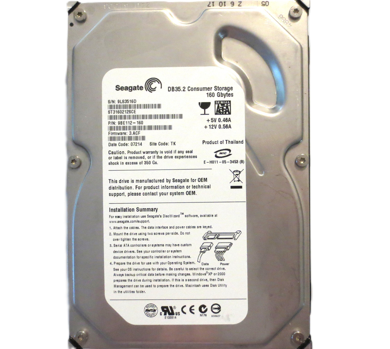 This item is for one Seagate ST3160212SCE 9BE112-160 3.ACF TK (9LS) Thailand 3.5" 160gb Sata NOV/2006. This drive and all of our drives are professionally tested and wiped of all data on a DOD (Department of Defense) certified machine at OEM level. Once they pass our quality control they are in 100% perfect working condition!