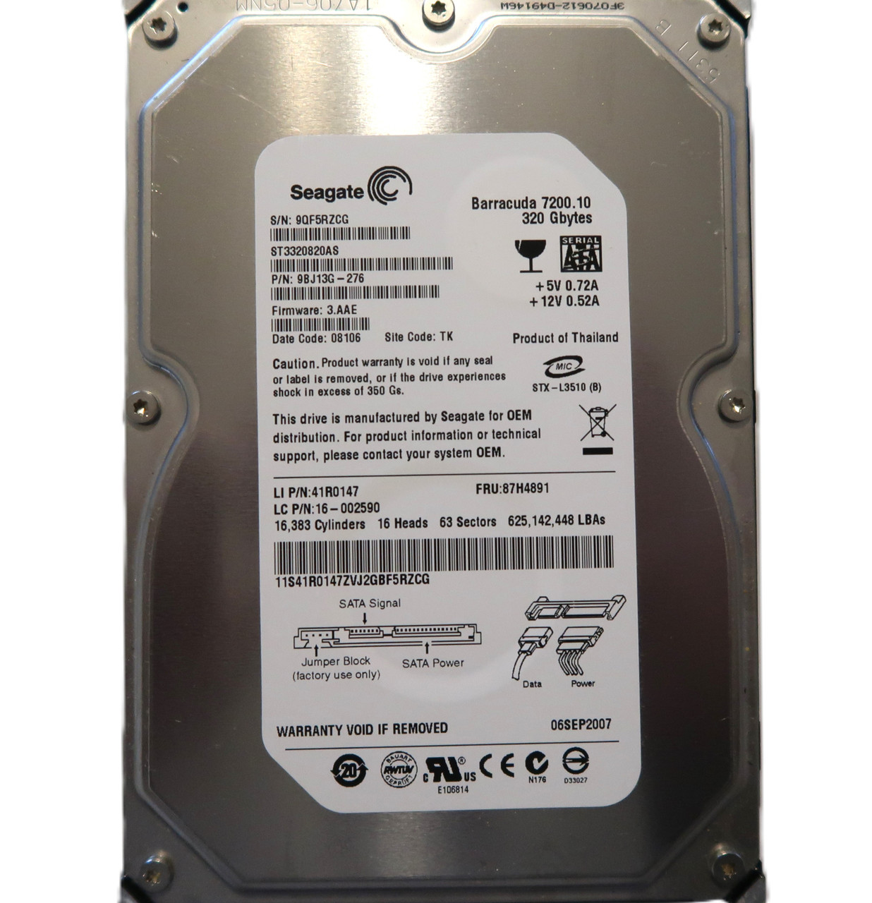 This item is for one Seagate ST3320820AS 9BJ13G-276 3.AAE (9QF) TK Thailand 320gb 3.5" Sata SEP/2007. This drive and all of our drives are professionally tested and cleaned on a DOD certified machine at Oem level. We do not use software for this process! Once they have passed our Quality control they are 100% in perfect working condition!